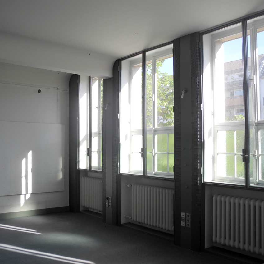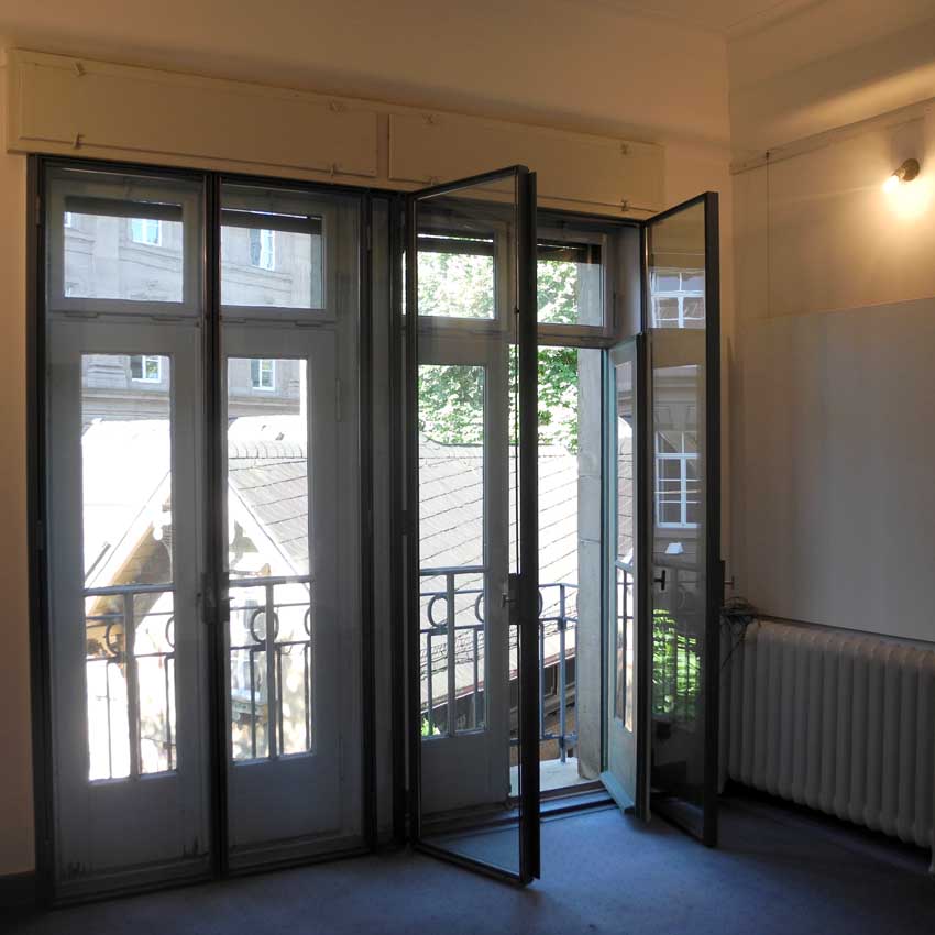Bei der Sanierung sind die bestehenden Atelierfenster aus Stahl ausgebaut und saniert worden. Sie erhielten 4 zusätzliche Flügel, um die Fenster reinigen zu können.