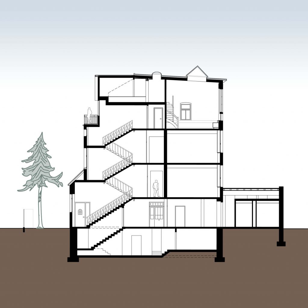 Dabei wurde die originale Substanz, Fenster, Holzrollläden, Heizkörper, Geländer und Terrazzoböden soweit möglich erhalten bzw. restauriert. Die ursprüngliche Farbigkeit des Hauses wurde wiederhergestellt.