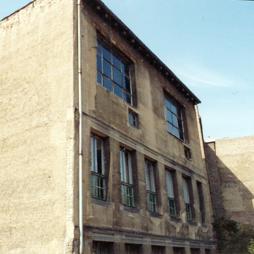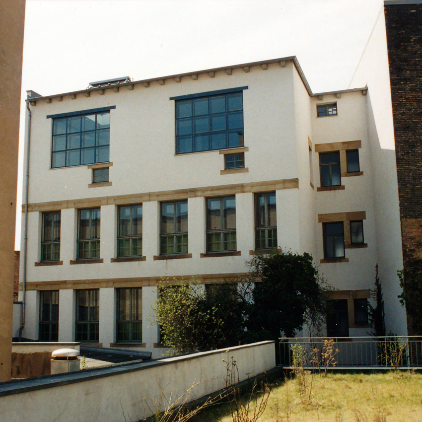 Während die Fassade zum Leopoldplatz noch an ein Wohnhaus denken lässt, ist hier die geplante Nutzung als Büro- und Ateliergebäude deutlich ablesbar mit großen, deckenhohen Fenstern für die damaligen Zeichensäle im 1. und 2.OG und zweigeschossigen Atelierfenstern im 3.OG.