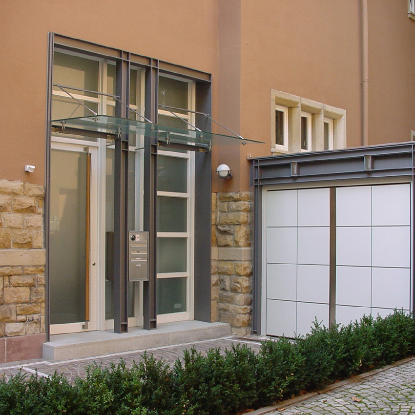 Wohngebäude Ansicht Straßenseite Eingangsbereich WOHNGEBÄUDE Standort: Karlsruhe, WeststadtBaujahr: 1903Umbau: 1998Bauherr: privatMaßnahmen: Umbau und Modernisierung des gesamten GebäudesAnbau eines WintergartensSchaffung von Verbindungen zw. jeweils zwei Geschossen durch neue interne TreppenNeugestaltung des EingangsbereichsVerlegung der Außentreppe in das Gebäude Eingangsbereich vor Umbau