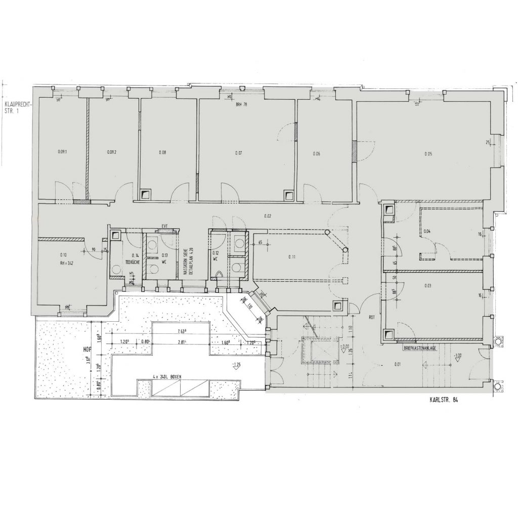 Wohngebäude WOHN- UND GESCHÄFTSHAUS Standort: Karlsruhe, SüdweststadtBaujahr: 1897Umbau: 1988Bauherr: Allinaz AGMaßnahmen: Umbau und Modernisierung des gesamten GebäudesAustausch aller FensterelementeEinbau eines neuen AufzugsErneuerung der gesamten Haustechnik Grundriss Erdgeschoß